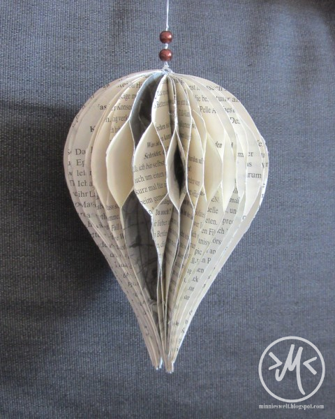 Weihnachtsdekoration aus Papier zu machen, finde ich übrigens eine ganz tolle Idee. Ich bin nämlich überhaupt kein Fan von Glitzer und grellen Farben zur Weihnachtszeit, umso besser finde ich schlichte Dekoration. Schließlich können ja auch einfache, eher farblose Stücke ziemlich viel hermachen. Und genau das gefällt mir an bedruckten und recycelten Weihnachtsdekostücken: dass man nämlich ein wenig Müll vermeidet und alten Büchern und Zeitungen ein zweites Leben gibt, das noch dazu sehr dekorativ ist. Hier und da ein kleiner Farbakzent (schöne Perlen, ein wenig Buntpapier oder der Einsatz von Lackspray) reichen oft schon, um den teilweise recht kompliziert wirkenden Falt- und Klebewerke den letzten Schliff zu geben. Viel gelesene Bücher eignen sich übrigens auch sehr gut für gewisse Basteleien, weil die Seiten schon so richtig schön gebogen und benutzt sind!